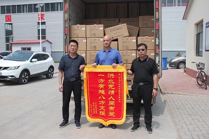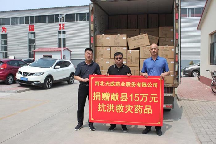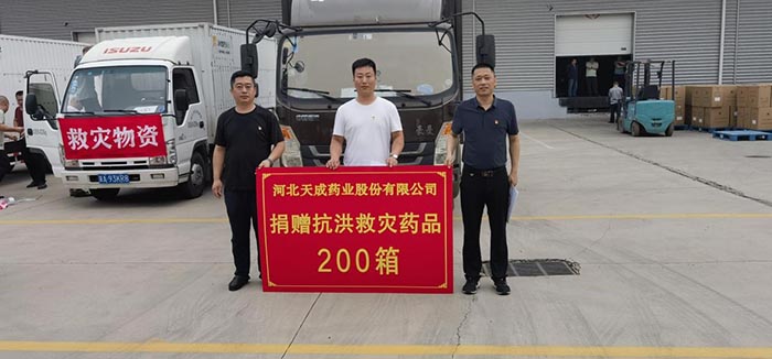 與此同時,在省藥監局綜合處趙志國部長統籌安排下,天成藥業捐贈的200箱藥品被運到石家莊與華潤醫藥商業津冀大區、河北九州通醫藥捐贈的藥品匯集,有序發往定興縣、涿州市、易縣和淶水縣五個縣市用于救災。