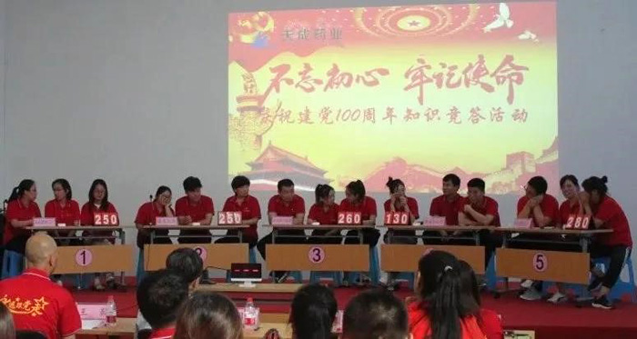 6月29日下午,中共河北天成藥業股份有限公司黨總支表彰大會暨黨史知識競答活動在三分廠黨員活動室隆重舉行。黨總支部正式黨員、預備黨員、入黨積極分子和已寫入黨申請書人員以及部分黨外群眾共計90余人參加,滄州市經濟技術開發區企業黨委負責人曲明利受邀參加此次活動。