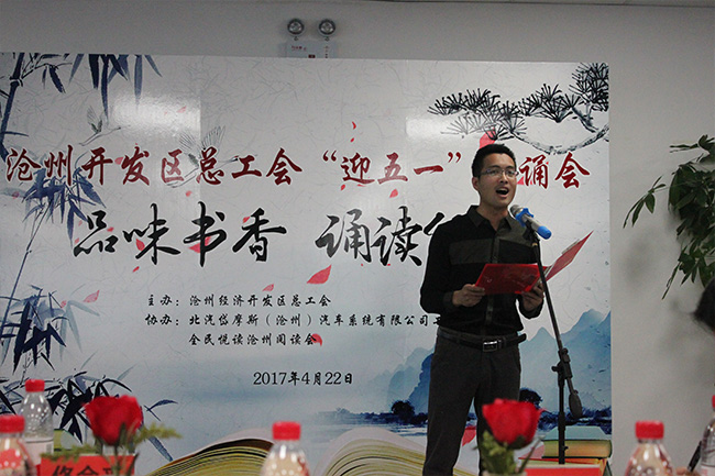 2017年4月22日,滄州開發(fā)區(qū)總工會(huì)主辦,北汽岱摩斯(滄州)汽車系統(tǒng)有限公司工會(huì)、全民悅讀滄州閱讀會(huì)協(xié)辦的“迎五一誦讀會(huì)”如期舉行。此次朗讀會(huì)主題為“品味書香,誦讀經(jīng)典”,是為打造滄州東部新城,在開發(fā)區(qū)推廣全民閱讀的一次嘗試。我公司職工劉艷麗、鄭福貴分別在會(huì)上深情朗讀了詩歌《相信未來》、《希望,展翅飛翔》。